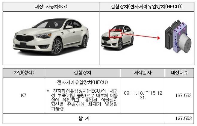 먼저, 기아의 K7 13만7천553대는 전자제어유압장치 내구성 부족에 따른 화재 발생 가능성으로 어제(16일)부터 시정조치를 진행했습니다. 쏘렌토 하이브리드와 쏘렌토 10만23대는 주간주행등이 정상 작동하지 않는 안전기준 부적합으로 내일(18일)부터 시정조치에 들어갑니다.