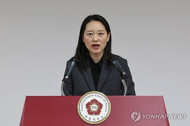 (서울=연합뉴스) 임화영 기자 = 이진 헌법재판소 공보관이 17일 오전 서울 종로구 헌법재판소 별관에서 윤석열 대통령 탄핵심판 관련 브리핑을 하고 있다. 2024.12.17