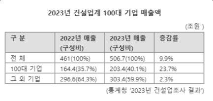17일 통계청 ‘2023년 건설업조사 결과’에 따르면 지난해 건설업계 전체 매출은 506조7000억원으로 전년대비 9.9% 증가했다. 토건업종 시공능력평가액 순위 기준 상위 100대 건설사 매출은 203조4000억원으로 전년대비 23.7% 증가했다. 반면 그 외 건설사 매출은 303조4000억원으로 전년대비 2.3% 증가하는데 그쳤다. 지난해 건설업체 전체 기업 수가 8만7891개인 만큼 그 외 기업은 8만7791개에 달하는 셈이다.