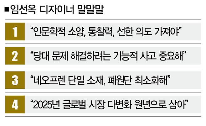 "디자이너는 단순히 아름다운 옷을 만드는 사람이 아니라, 당대의 문제를 해결하는 사람이어야 한다"고 강조해온 임 디자이너를 만났다.[※참고: 전세계 탄소배출량 중 패션산업이 차지하는 비중은 8~ 10%(UN·2018년)에 달하고, 매년 생산한 섬유의 85%(WEF ·2020년)가 버려진다.]