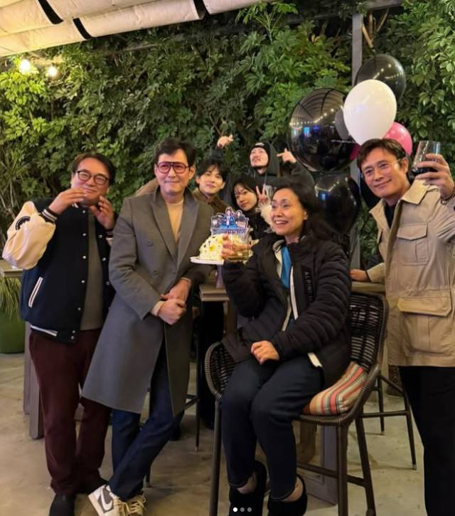 사진 속 이정재는 이병헌과 함께 생일상을 둘러보는 모습이다. 또한 양동근 등 ‘오징어게임2’ 출연진과도 기념 사진을 찍었다.