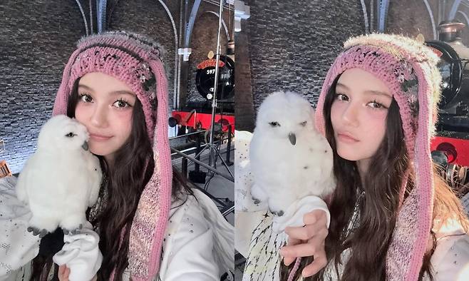 다른 사진에서 다니엘은 분홍색 모자를 착용하고, 포즈를 취하며 사랑스러운 매력을 뽐냈다. 그의 뒤로는 호그와트 급행열차가 자리 잡고 있다.