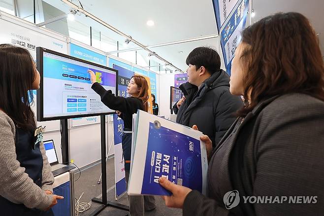 (인천=연합뉴스) 임순석 기자 = 17일 인천 연수구 송도컨벤시아에서 열린 '2024 인천디지털교육 페스티벌'에서 선생님들이 AI디지털교과서에 대한 설명을 듣고 있다. 2024.12.17