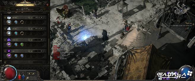 물론 이같은 난관을 넘어 셋팅을 갖추면 적들을 학살하는 POE만의 재미를 느낄 수 있었다. POE2는 이용자들이 성장 체감을 빠르게 느낄 수 있도록 접근성 측면에서 변화를 이뤄냈다. 가장 큰 변경점은 스킬이다. 이용자는 별도로 구현된 메뉴 속 '스킬 창'에 젬(보석)을 등록하면 자유롭게 이를 활용할 수 있다. 스킬 보조도 '스킬 창'에서 모두 덧붙일 수 있기 때문에 매우 편리해졌다.