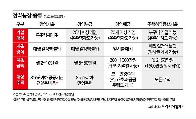 청약저축의 경우 대상자는 무주택세대주, 대상 주택은 85㎡ 이하 공공기관 건설주택 등이다. 매월 2만~10만원을 불입토록 했다. 청약부금과 예금은 민영주택을 대상으로 하는 상품이다. 청약부금의 경우 대상자는 20대 이상 개인(유주택자 포함), 대상 주택은 85㎡ 이하 민영주택이며 매월 5만~50만원을 불입토록 했다.