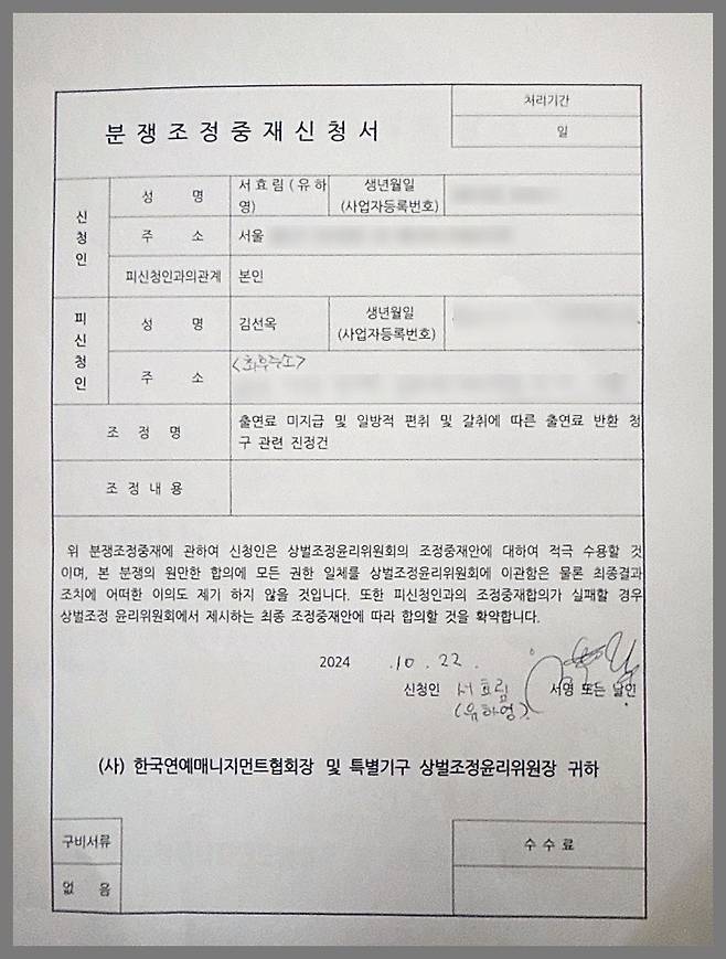 서효림은 지난 10월, 미정산 문제 해결을 위해 ‘연매협’의 문도 두드렸다. ‘상벌위’(상벌조정윤리위원회)에 분쟁조정중재신청서를 접수, 출연료 편취에 따른 반환 청구 진정을 냈다.