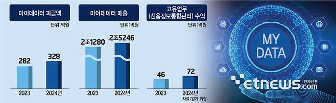 실제 마이데이터 사업자들은 마이데이터 본사업으로 수익을 거의 내지 못하고 있다. 지난해 마이데이터 사업자 전체 매출액 2조5246억원 중 고유 업무인 신용정보통합관리 수익은 72억원에 불과했다. 전체 매출에서 차지하는 비율은 0.2% 수준이다. 2022년도 마이데이터 사업자 전체 매출은 2조1760억원이었지만, 신용정보통합관리 수익은 46억원에 그쳤다.