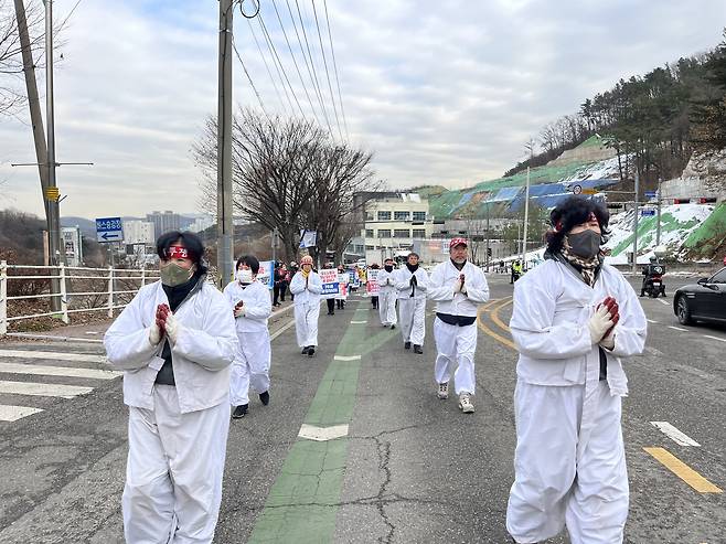 오체투지 하는 중간중간 조합원들의 절절한 목소리가 앰프를 통해 흘러나온다.