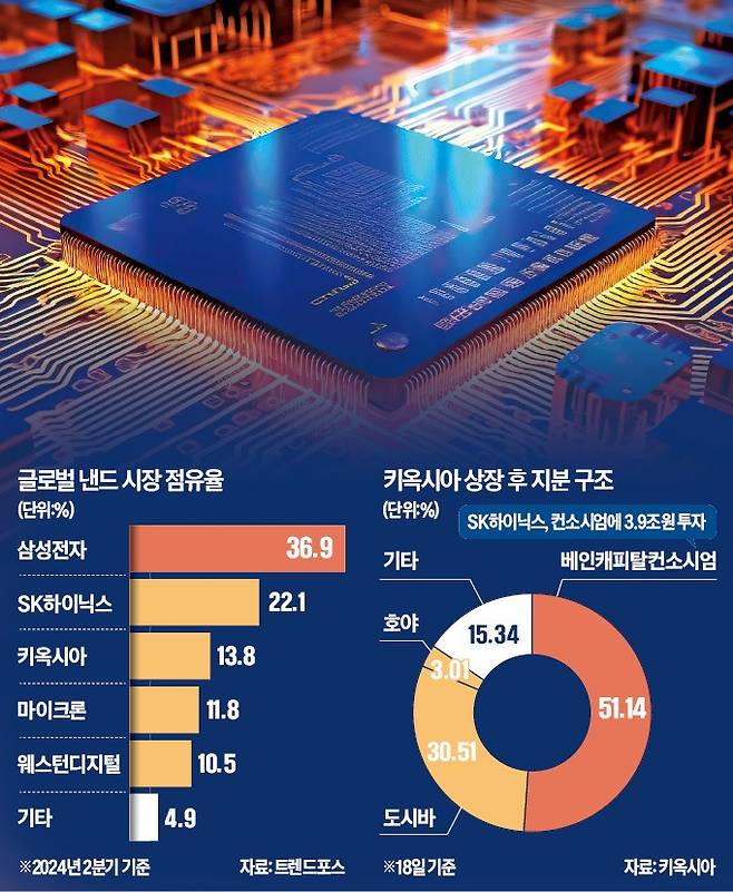 키옥시아는 2020년과 2021년 IPO를 추진했지만 코로나19 확산으로 불발됐다. 이후 IPO 대신 세계 4위 낸드 업체 미국 웨스턴디지털과의 합병으로 기업 가치를 올리려 했지만, 주요 투자자인 SK하이닉스가 반대해 무산됐다. SK하이닉스는 베인 컨소시엄에 약 3조9000억원을 투자해 지분 15%(상장 전)를 간접 보유하고 있다.