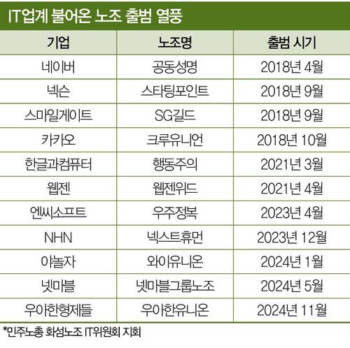 네이버가 노조 설립 석 달 만에 포괄임금제를 폐지하는 등 성과를 내자 이후 IT 기업 화섬노조 지회 출범이 잇따랐다. 2018년 9월 넥슨 노조가 ‘스타팅포인트’로 출범한 데 이어 9월에는 스마일게이트 ‘SG길드’, 10월에는 카카오가 ‘크루유니언’이라는 이름으로 노조 설립을 알렸다. 강성 노조 이미지를 벗기 위한 특유의 ‘신선한 작명’이 IT업계 노조 트렌드로 자리 잡았다. 2021년에는 한글과컴퓨터 ‘행동주의’와 웹젠 ‘위드’, 2023년에는 엔씨소프트 ‘우주정복’과 NHN ‘넥스트휴먼’이 출범했다.