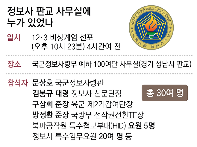 이날 동아일보 취재를 종합하면 북파공작원 특수부대(HID) 요원 5명을 포함한 정보사 특수임무 요원 30여 명이 계엄 선포 4시간여 전인 3일 오후 6시를 전후해 100여단 건물에 모여 대기했을 당시 이 건물에 구 여단장과 방정환 국방부 전작권전환TF장(육군 준장)도 도착했다. 구 여단장과 방 TF장은 문상호 정보사령관이 오후 10시쯤 정보사 부대원들을 회의실에 모아놓고 “곧 계엄이 선포될 것”이라며 각자의 임무를 알려줬을 때도 별도의 사무실에서 대기했다고 한다. 두 사람은 “영문을 모른 채 대기하다가 TV를 보고 계엄 선포 사실을 알고 크게 놀랐다”고 수사기관에 진술한 것으로 알려졌다.