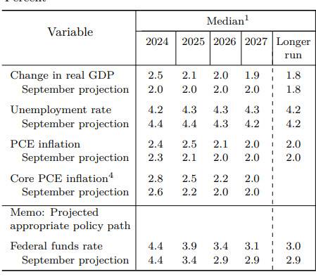 이에 따라 현재 기준금리 4.25~4.5%에서 내년엔 약 두차례 인하만 가능하다고 연준은 보고 있다.