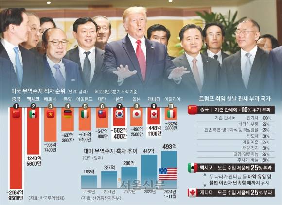 고관세 정책은 현실화하고 있다. 트럼프 당선인은 지난달 26일 “취임과 동시에 멕시코와 캐나다에서 들여오는 모든 제품에 25%를 부과하고, 중국에 대해선 10% 추가 관세를 매기겠다”고 선언했다. 한국은 중국·멕시코·베트남·독일·아일랜드·대만에 이어 일곱 번째로 많은 적자를 미국에 안기는 나라다. 대미 무역수지 흑자는 올해 처음으로 500억 달러를 돌파할 것으로 보인다. 전문가들은 한국도 트럼프 당선인의 ‘관세 폭탄’ 사정권을 오롯이 벗어나기는 어렵다고 본다. 강인수 숙명여대 경제학부 교수는 “트럼프가 한국보다 개방도가 높은 멕시코와 캐나다에 25% 관세를 부과한다고 한 터라 한국도 10~20%를 피해 가기는 어려워 보인다”고 전망했다.