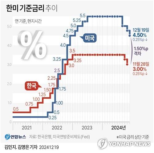 연준은 이날 연방공개시장위원회(FOMC) 정례회의 뒤 기준금리를 기존보다 0.25%포인트 낮은 4.25~4.50%로 조정한다고 밝혔다. 연준의 이번 결정으로 한국(3.0%)과 미국간 금리차는 상단 기준으로 기존 1.75%포인트에서 1.5%포인트로 다시 줄어들게 됐다.