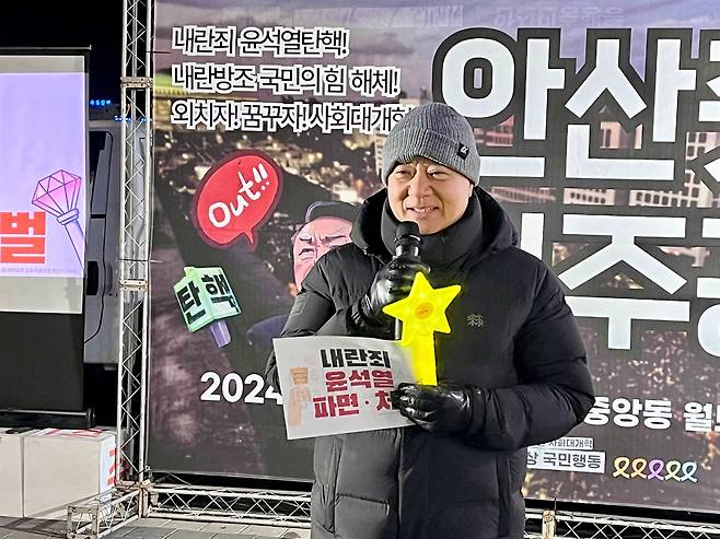 14일 여의도광장에서 열렸던 범국민촛불대행진 영상 상영으로 시작한 안산 송년촛불광장의 첫 순서는 기본소득당 안산시지역위원회 서태성 부위원장, 진보당 안산시위원회 박범수 위원장, 정의당 안산시위원회 고갑호 사무국장의 규탄 발언으로 이어졌다.
