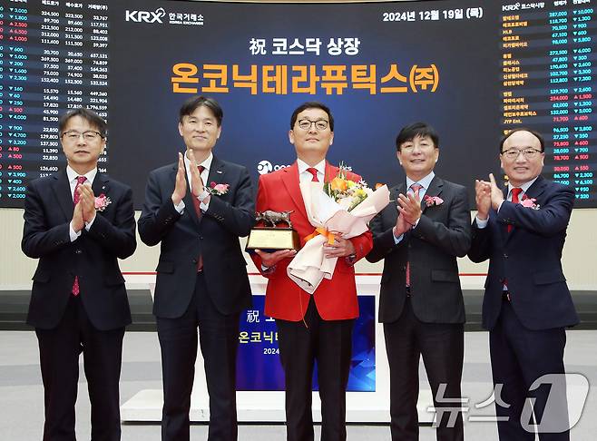 왼쪽부터 김대영 한국IR협의회 부회장, 민경욱 한국거래소 코스닥시장본부장, 김존 온코닉테라퓨틱스(주) 대표이사, 이성 NH투자증권 사업부대표, 강왕락 코스닥협회 부회장. (한국거래소 제공) 2024.12.19/뉴스1