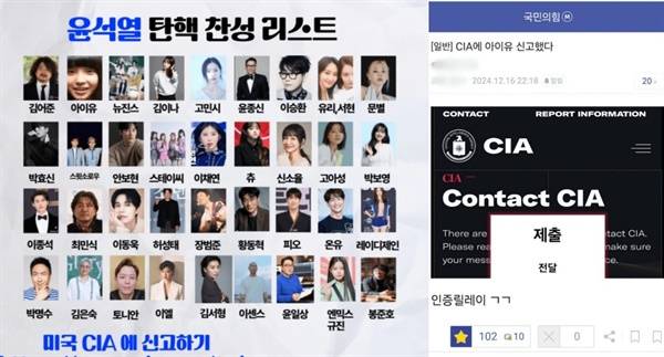 이들은 아이유, 소녀시대 유리, 뉴진스 등 윤석열 탄핵 집회를 후원한 연예인들은 반미주의자이기 때문에 미 CIA에 신고하면 미국 입국을 거부당한다고 주장하며 고발 인증 릴레이까지 펼치고 있습니다.