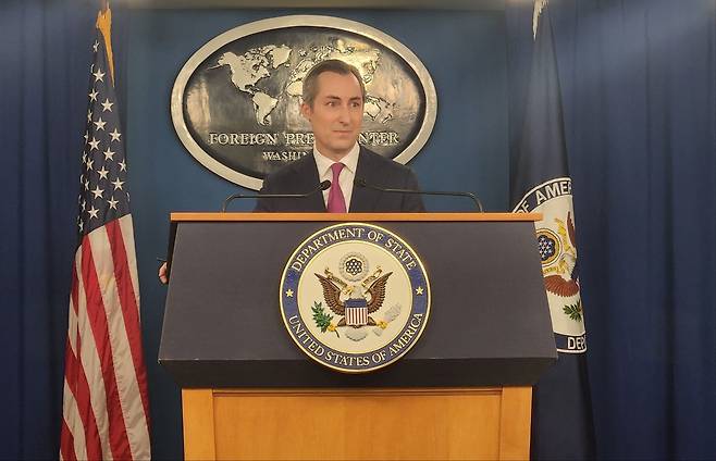 | ▲ 매슈 밀러 미국 국무부 대변인이 지난 17일(현지시간) 미국 워싱턴DC의 외신센터에서 브리핑하고 있다. |