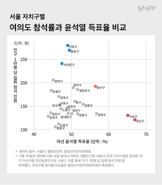 12월 14일 여의도 생활인구 증가분을 서울 25개 자치구별로 파악한 뒤 윤석열 득표율과 비교한 결과, 명확한 상관관계는 나타나지 않았으나 일부 자치구에서 눈에 띄는 경향이 확인됐다.