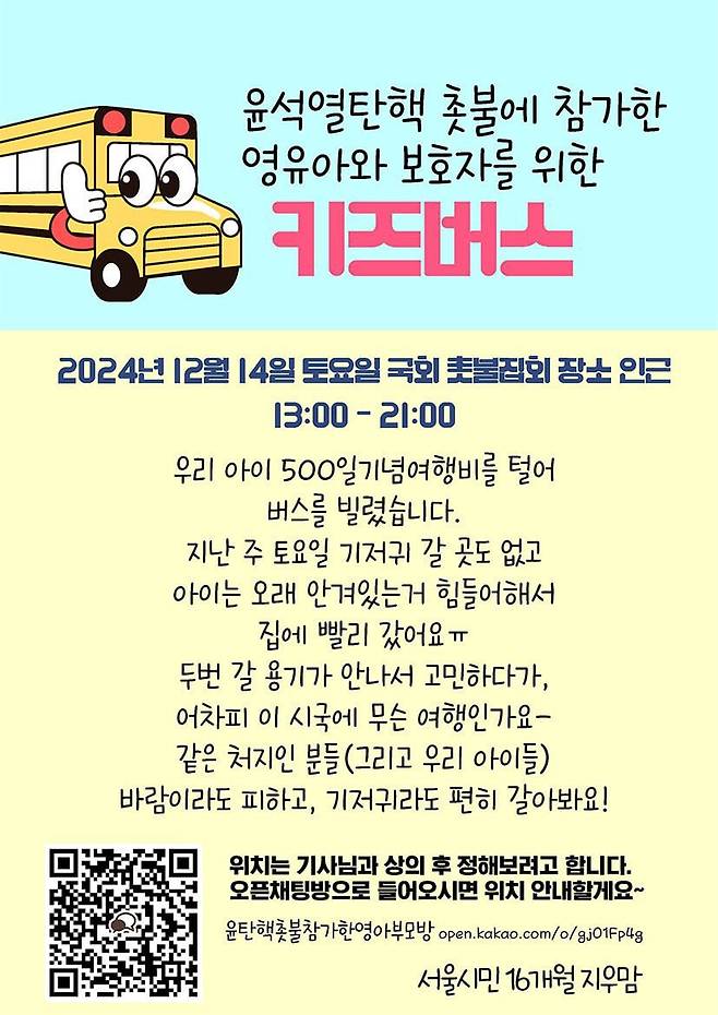 실제 12월 14일 2차 탄핵집회 때는 아이와 함께 집회에 참여한 부모들이 많았다. 한 40대 여성은 딸의 생후 500일 기념 여행비를 털어 기저귀갈이, 수유를 위한 ‘키즈버스’를 운영하기도 했다. 이러한 사연이 알려지자 후원금이 모여 45인승 버스가 2대로 늘어나는 등 큰 호응을 얻었다.