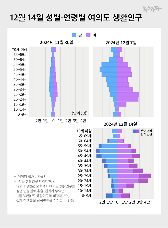 12월 14일 윤석열 대통령 탄핵안 표결을 앞둔 오후 4시, 서울 여의도의 생활인구가 51만 8천명으로 집계됐다. 그중 가장 큰 비중을 차지한 집단은 20대 여성이었으며, 1주 전인 1차 탄핵집회와 비교해 가장 큰 비율로 증가한 집단은 30~49세 여성과 0~19세 남녀였다.