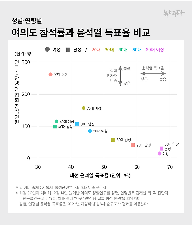 비교 결과, 뚜렷한 상관관계가 보였다. 윤석열 득표율이 낮았던 20대 여성과 40대 남녀 등은 집회 참석률도 높은 편이었다. 반면 윤석열 득표율이 높았던 60대 이상 남녀와 20대 남성 등은 집회 참석률도 낮은 편이었다.