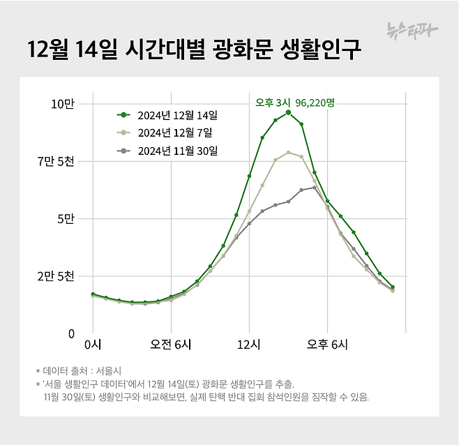 한편, 12월 14일 서울 광화문 일대에서는 보수성향 단체들이 주최한 탄핵 반대 집회가 열렸다. 뉴스타파가 집회 장소 집계구의 생활인구 데이터를 확인한 결과, 집회 인파가 정점을 찍은 오후 3시 이 지역 생활인구는 9만 6220명이었다. 11월 30일 오후 3시 생활인구인 5만 7489명과 비교해 3만 8731명이 늘어난 수치다.