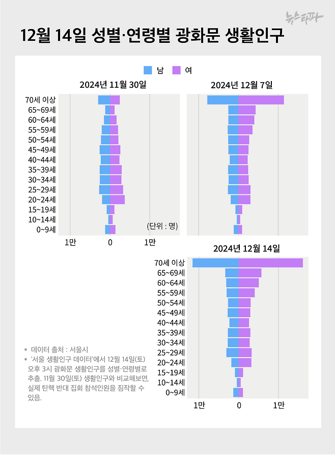 광화문 집회에서는 70세 이상 인구가 가장 큰 비중을 차지했다. 12월 14일 오후 3시 기준, 70세 이상 여성이 17%로 1만 6150명, 70세 이상 남성이 12%로 1만 1587명이었다. 이날 60대를 포함한 고령층 생활인구 비율은 47%였다. 광화문 지역 상주 인구와 관광객 중 젊은 층 비율이 높다는 점을 고려하면, 실제 광화문 집회에 참여한 고령층 비율은 50%를 훨씬 넘겼을 것으로 추정된다.