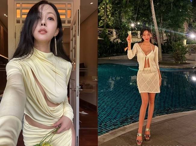 뿐만 아니라 풀파티 현장을 배경으로 가슴골이 훤히 드러난 비키니를 입은 모습이 포착됐다. 그녀는 쭉 뻗은 기럭지와 S라인으로 관능적인 매력을 뽐냈다.