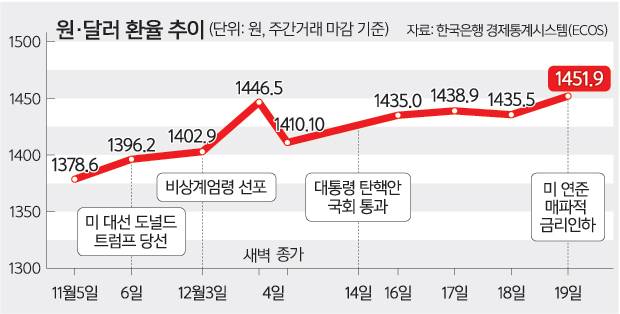 문정희 KB국민은행 수석연구원은 “정부가 환율 방어를 위해 노력하겠지만 1420∼1430원 이하로 내려가기는 힘들 것”이라며 “글로벌 위험회피 심리가 지속되고 트럼프발(發) 충격이나 돌출 변수가 나온다면 환율은 지금보다 20원 정도 더 오를 수도 있다”고 분석했다. 이어 “달러 강세 기조는 내년 초까지 이어질 것”이라며 “당초 내년 평균 환율을 1370원으로 봤는데 FOMC 충격으로 15원 정도 더 올려야 할 것 같다”고 덧붙였다.