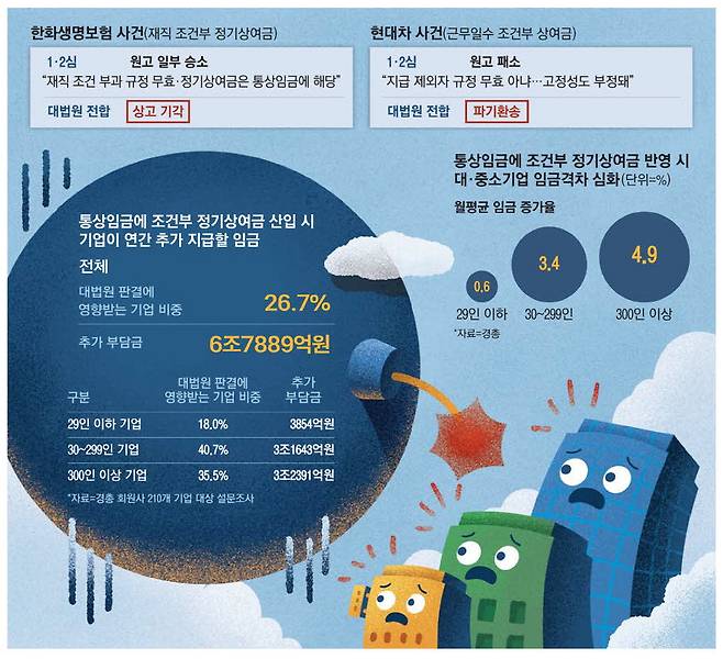 대법원이 통상임금에 포함되는 '정기상여금'의 범위를 대폭 확대하라는 취지의 판단을 내놓으면서 산업계가 큰 혼란에 빠졌다. 이번 판결로 그동안 통상임금에 포함되지 않았던 금액까지 인정하게 되면 연간 수조 원에 달하는 추가 인건비 지출이 발생한다는 분석이 나왔다.