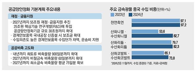 문제는 한국의 주요 금속광물에 대한 중국 수입 의존도가 갈수록 높아지고 있다는 것이다. 관세청에 따르면 올해 들어 11월까지 천연흑연 중국 수입 비중은 97.2%를 기록했다. 산화니켈·수산화니켈 등은 지난해 중국 수입비중이 53.6%였지만 올해 82.7%까지 치솟았다. 정부는 공급망 안정화를 위해 기업들에 대한 인센티브를 대폭 늘린다. 우선 경제안보품목 관련 국내 생산시설 투자에 대한 금융·재정·세제 지원을 확대한다. 경제안보품목은 차량용 요소, 형석 등 수입 의존도가 높거나 경제의 안정적 운영에 필요한 품목이다.