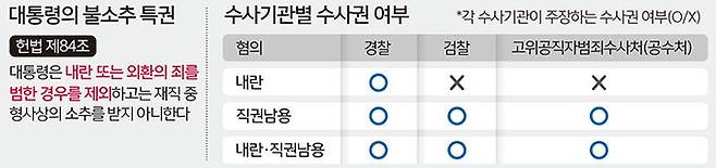 검경으로부터 윤 대통령 사건을 이첩받기로 한 고위공직자범죄수사처(공수처)는 내란죄에 대한 수사권이 없다. 공수처는 윤 대통령이 받고 있는 또 다른 혐의인 직권남용죄의 ‘관련 범죄’이기 때문에 내란 혐의에 대한 수사권도 있다는 입장을 취하고 있다. 그러나 직권남용죄는 대통령의 형사소추 범위에 포함되지 않는다. 이 때문에 현직 대통령을 대상으로 내란죄와 직권남용을 함께 묶어서 기소하는 것은 불가능하다는 지적과 함께, 탄핵 후 기소할 가능성이 제기되는 것이다.
