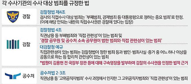 공수처법은 공수처가 고위공직자 범죄 수사 과정에서 인지한 그 고위공직자 범죄와 ‘직접 관련성’이 있는 죄로서 해당 고위공직자가 범한 죄를 수사할 수 있다고 규정한다. 직권남용죄는 고위공직자 범죄이고 이와 ‘직접 관련성’이 있는 내란 혐의도 수사할 수 있다는 게 공수처 입장이다. 검찰도 검찰청법과 대검 예규상 같은 이유로 수사권이 있다고 보고 내란 혐의에 대한 수사를 개시했다. 그러나 윤 대통령에 대한 중복 소환 문제가 불거지면서 대검찰청은 전날 윤 대통령, 이상민 전 행정안전부 장관에 대한 사건을 공수처에 이첩했다.
