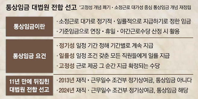 이날 선고된 사건의 쟁점은 통상임금의 개념을 어떻게 재정립할 것인지 등이었다. 앞서 자동차 부품업체인 갑을오토텍 통상임금 관련 사건을 심리한 대법원 전합은 2013년 조건부 정기상여금의 경우 해당 요건 중 고정성이 인정되지 않는다는 이유로 통상임금에 해당하지 않는다고 판단했다. 근로자가 근로를 제공하는 시점에서 퇴직 여부, 근무 일수 충족 여부 등 상여금 지급 조건 성취 여부가 불확실하기 때문에 고정성이 부정된다는 취지다.