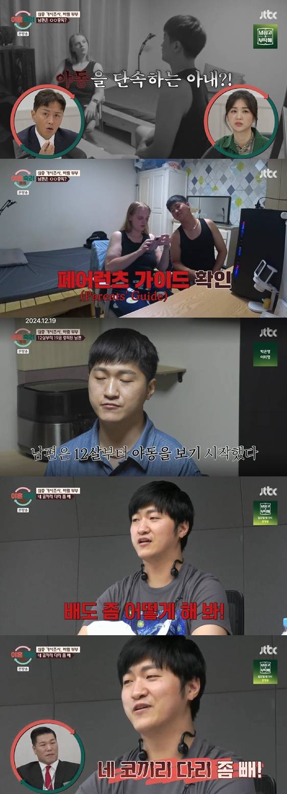 바람부부 아내는 "날씬하고 섹시한 여자 나오는 야동 보면 좋아한다. 야동을 보면 스킨십하기 싫어한다. 부부 관계하기 싫어한다"고 토로했다.