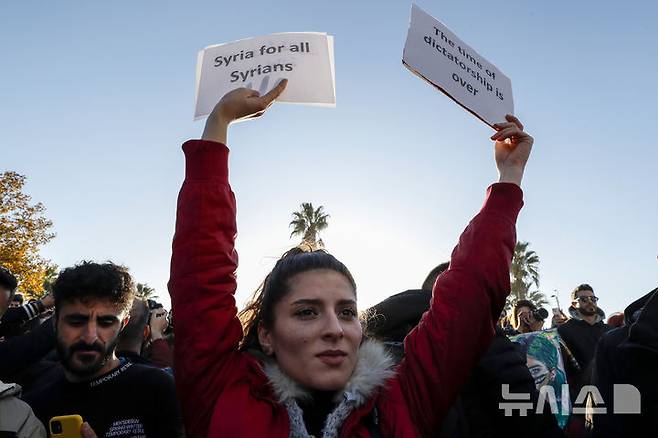 [다마스쿠스=AP/뉴시스] 19일(현지시각) 시리아 다마스쿠스의 우마이야 광장에서 세속주의 국가를 요구하는 시위가 열리는 동안 한 여성이 "모든 시민을 위한 시리아" "독재 없는 시대"라고 쓰인 손팻말을 들고 있다. 2024.12.20.
