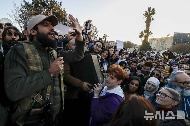 [다마스쿠스=AP/뉴시스] 19일(현지시각) 시리아 다마스쿠스의 우마이야 광장에서 활동가들이 세속주의 국가 요구 시위를 벌이는 동안 한 반군 전투원이 발언하고 있다. 활동가들은 종교적 강요와 차별을 없애고 모든 시민이 평등한 권리를 누릴 수 있는 체제를 요구하고 있다. 2024.12.20.