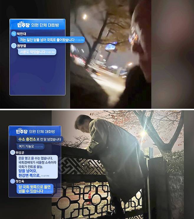 [이건태] 국회를 막고 있다면 플랜B 마련해야. 10:58 [임호선] 당사로 모여야 할 듯합니다 10:58 [강유정] 정문은요? 10:58 [박찬대] 모두 일단 잡히지 않게 조심하세요 10:59 [강유정] 해제하려면 국회가야 합니다 10:59 [전용기] 본회의장으로 가야합니다 10:59 [신정훈] 겨 (국회 앞 사진) [강선우] (국회 앞 사진) 정문 막혔습니다. 10:59 [송재봉] 국회에 들어갈 수가 없습니다. 11:00 [김용민] 한 곳에 모여서 뚫고 들어가야 하지 않을까요. 11:00 [최민희] 당사로 11:00 [최민희] 일단 11:00 [박찬대] 저는 일단 담을 넘어 국회로 들어왔숩니다 11:00 [정진욱] 옆문도 막았습니다. 11:00 [정진욱] 저도 담으로 들어갑니다. 11:00 [강선우] 지금 아무데도 못 들어갑니다. 11:00 [권향엽] 서문도 막았습니다 11:00 [최민희] 어느 담이요? 11:01 [권향엽] 최대한 들어 오셔야합니다 11:01 [이건태] 담을 넘을 수가 있으면 국회로 들어가고 이게 안 된다면 당사로 모여야 하는데, 당사도 막고 있을 수 있습니다 11:01 (중략)