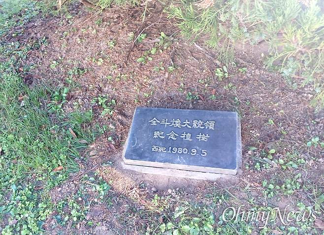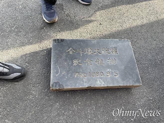 경남 합천군이 시민들에 의해 뽑혔던 전두환(1931~2021)씨의 기념식수 표지석을 다시 설치해 논란이다.