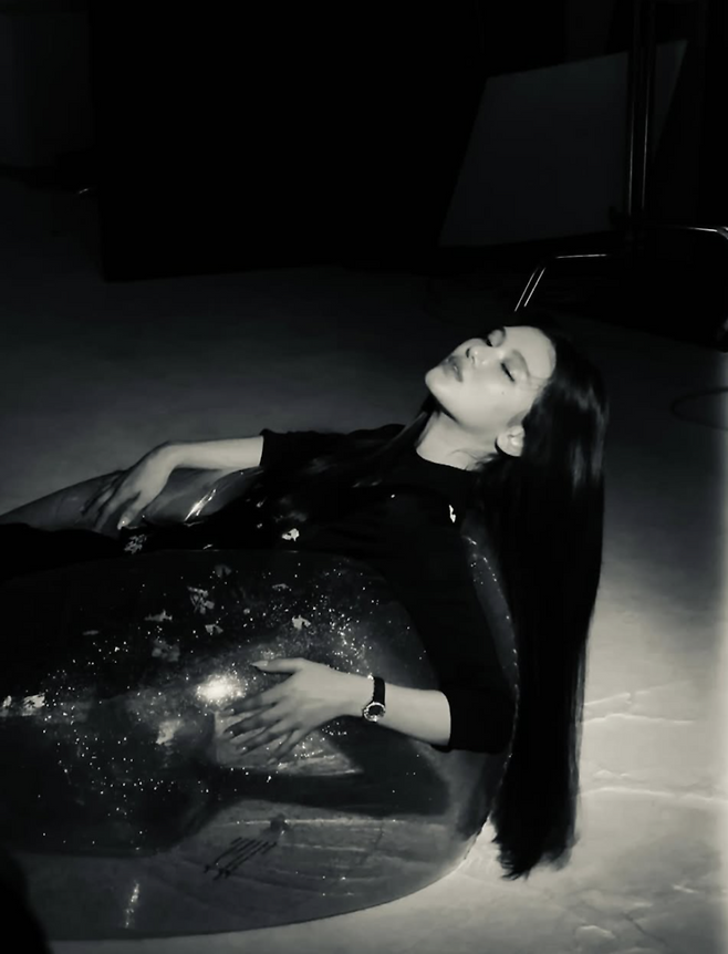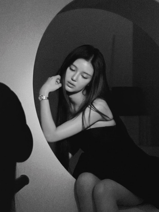 다른 흑백 사진에서는 등이 훤히 드러난 블랙 미니 드레스에 오메가 시계로 포인트를 준 코디에 앞머리 없는 긴생머리 스타일링을 매치해 고혹스러운 미모를 자랑했다.
