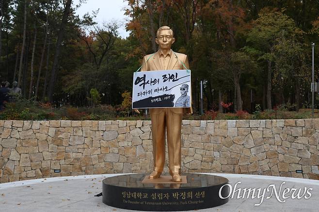 | ▲ 영남대 천마아너스파크에 세워진 박정희 전 대통령 동상에 10일 영남대 동문들이 '역사의 죄인 다카키 마사오'라고 쓴 팻말을 걸어두었다. |