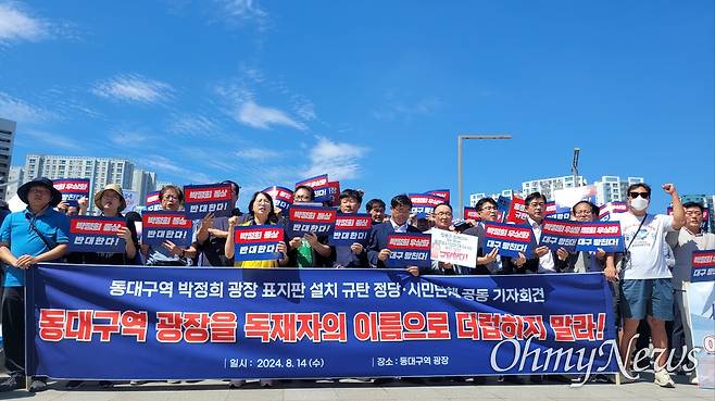 대구지역 시민사회단체로 구성된 '박정희우상화사업반대범시민운동본부'는 20일 성명을 통해 "민주주의를 파괴한 독재자 박정희의 동상을 세워 그의 업적을 기념하겠다는 발상은 도대체 어디서 나오는 것인가"라며 "홍 시장은 동대구역 광장에 반시대적, 반민주적인 박정희 동상 설치를 당장 중단하라"고 촉구했다.