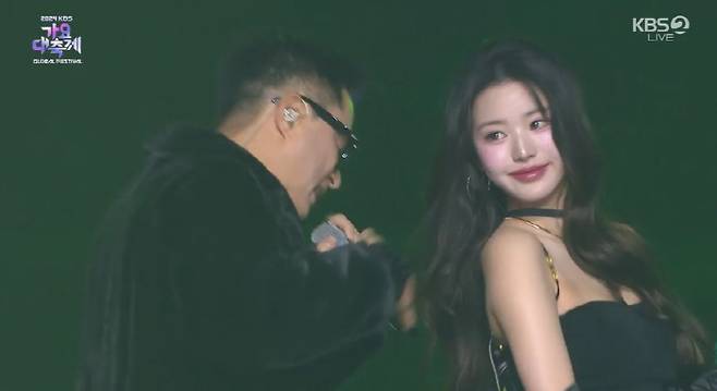 지코, 김영대와 함께 MC를 맡은 장원영은 지누션과 함께 '말해줘' 무대에 올랐다. 선배 가수 엄정화를 오마주한 장원영은 긴 머리를 휘날리며 등장, 독보적인 미모로 시선을 압도했다.