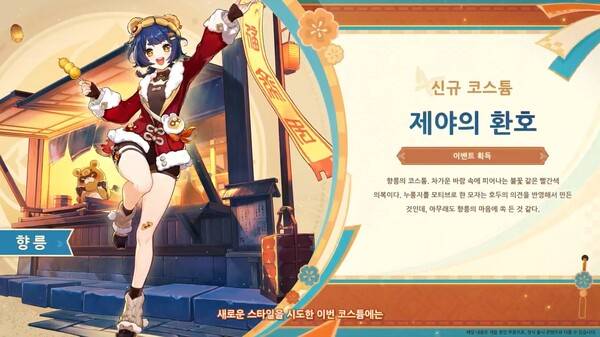향릉의 새로운 코스튬이다. 차가운 바람 속에 피어나는 불꽃같은 빨간색 의복이다. 누룽지를 모티브로 한 모자는 호두의 의견을 반영해서 만든 것인에 향릉도 이 디자인이 무척 마음에 든 모양새다. 해당 코스튬은 해등절 기간에 축제 열기를 일정량 모으면 무료로 획득 가능하다.