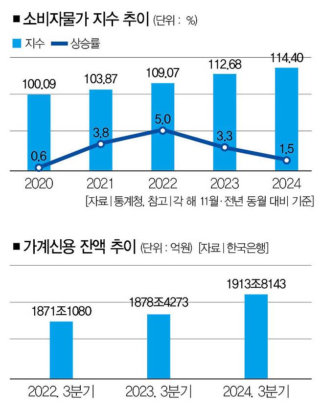 사람들의 지갑을 얼어붙게 하는 건 치솟은 물가만이 아니다. 장기간 이어졌던 고금리 기조 속에서 대출금은 눈덩이처럼 불어났다. 올해 3분기에도 가계빚(가계신용 잔액)은 사상 최대치를 갈아치웠다. 한국은행에 따르면 올해 3분기 가계대출과 외상거래(신용카드 등)를 합한 가계빚은 1913조8143억원으로 사상 처음으로 1900조원을 넘어섰다.