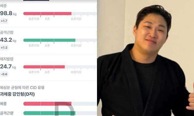 그가 공개한 자료에 따르면 스윙스의 골격근·지방분석을 한 결과 체중 98.8kg에 골격량 43.2kg, 체지방량 24.7kg으로 확인됐다. 또한 체지방률은 25%로 측정됐다.