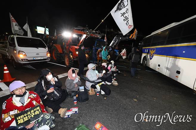 | ▲ '윤석열 체포구속' '사회대개혁' '개방농정 철폐' 등을 요구하며 서울로 향하던 전국농민회총연맹, 전국여성농민회총연합 소속 ‘전봉준투쟁단 트랙터 대행진’이 21일 오후 서울로 들어서는 서초구 남태령고개에서 경찰에 막혔다. 농민들이 길을 터줄 것을 요구하며 농성하는 가운데, 서울 도심에서 열린 범국민촛불대행진에 참석했던 시민들이 수백명이 합세해 함께 농성하고 있다. |