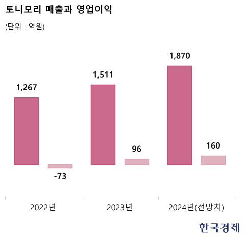 회사를 다섯 글자로 표현해달란 부탁엔 ‘지속성장중’이라고 답했다. 그는 “내년 20% 이상의 성장을 기대하고 2026년엔 한 번도 넘어본 적이 없는 연 매출 2500억원 시대를 열겠다”고 말했다. 토니모리 최고 실적은 2016년 매출 2300억원이다.