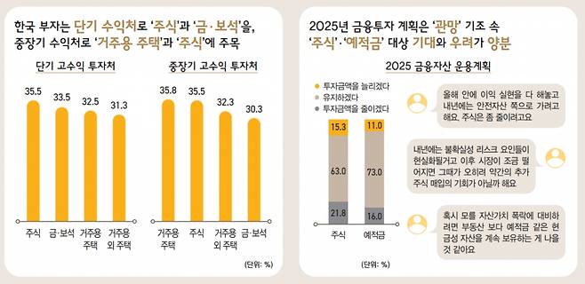 한국 부자는 단기적으로 '주식'(35.5%)과 '금·보석'(33.5%)에서, 중장기적으로 '거주용 주택'(35.8%)과 '주식'(35.5%)에서 고수익을 기대한다고 응답했다. 자산관리 관심분야 1위는 '국내 부동산 투자'(40.0%)였으며 '실물(금·보석) 투자'가 그 뒤를 이었다.